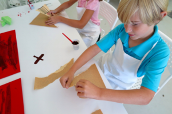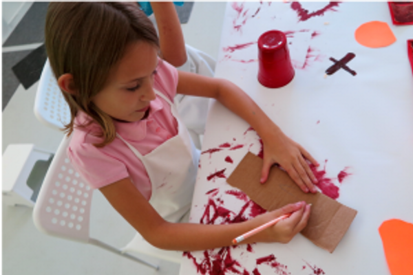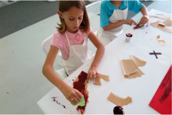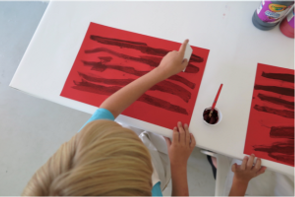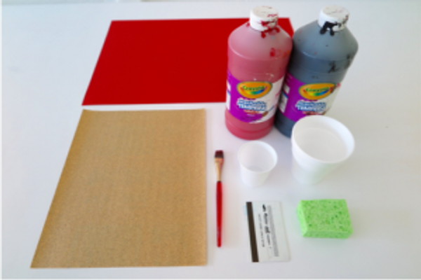 To begin Phase 2 of the project, you will need red construction paper, sand paper, a paintbrush, a cup or plate to mix paint, a kitchen sponge, a gift card, and black and red tempera or acrylic paint.