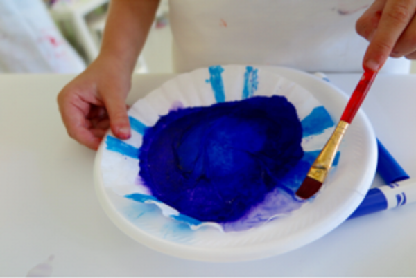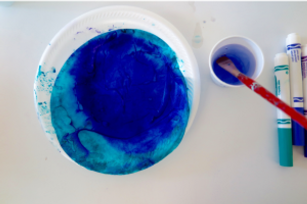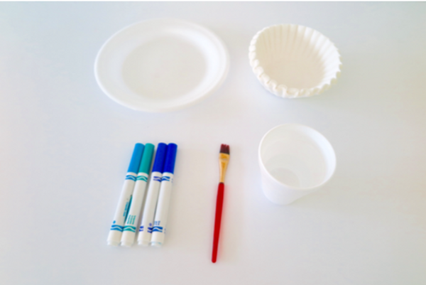 To begin Phase 1 of the project, you will need a coffee filter, blue markers, a paintbrush, a cup of water, and a plate. The plate is very important because it will catch the excess water.